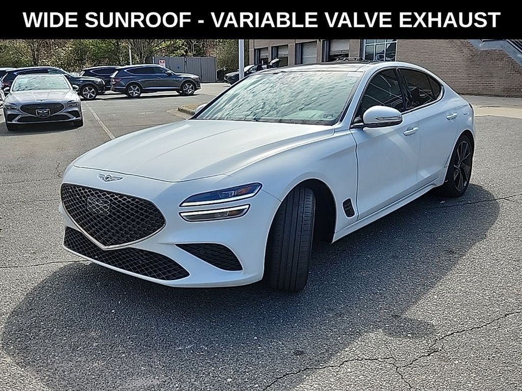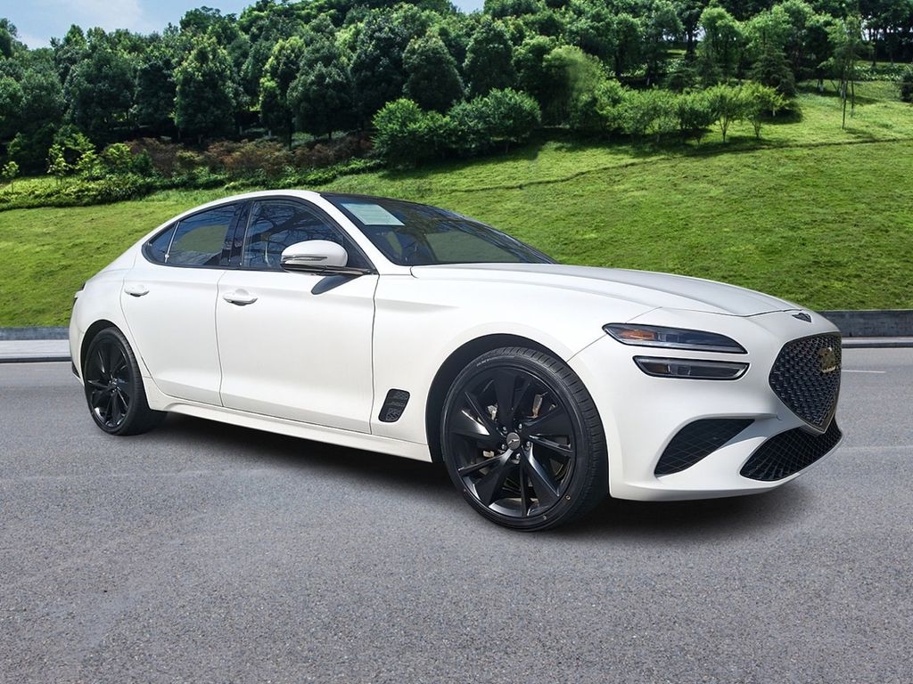Verbier White/Sandstorm Gray 2023 Genesis G70 RWD 3.3T Sport Advanced. (3.3L Twin Turbo V6 ((365 HP / 376 lb.-ft)), 8-speed Automatic Transmission w/ Paddle Shifters, Variable Exhaust Valve System, MacPherson Strut Front & Multi-Link Rear Suspension)
